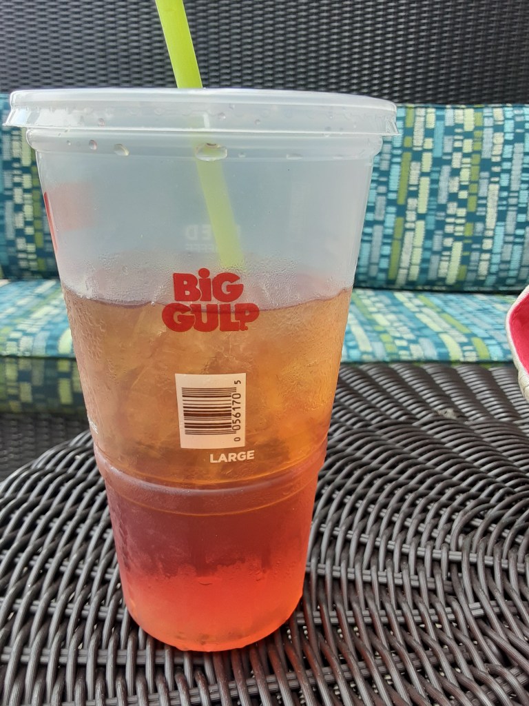 Dump the tea over the ice. A full coffee cup fills the big culp cup almost completely. It is delicious, maybe a bit more caffeine than usual,but who cares?It’s gonna be a long day.