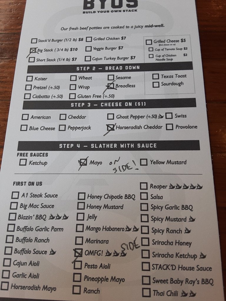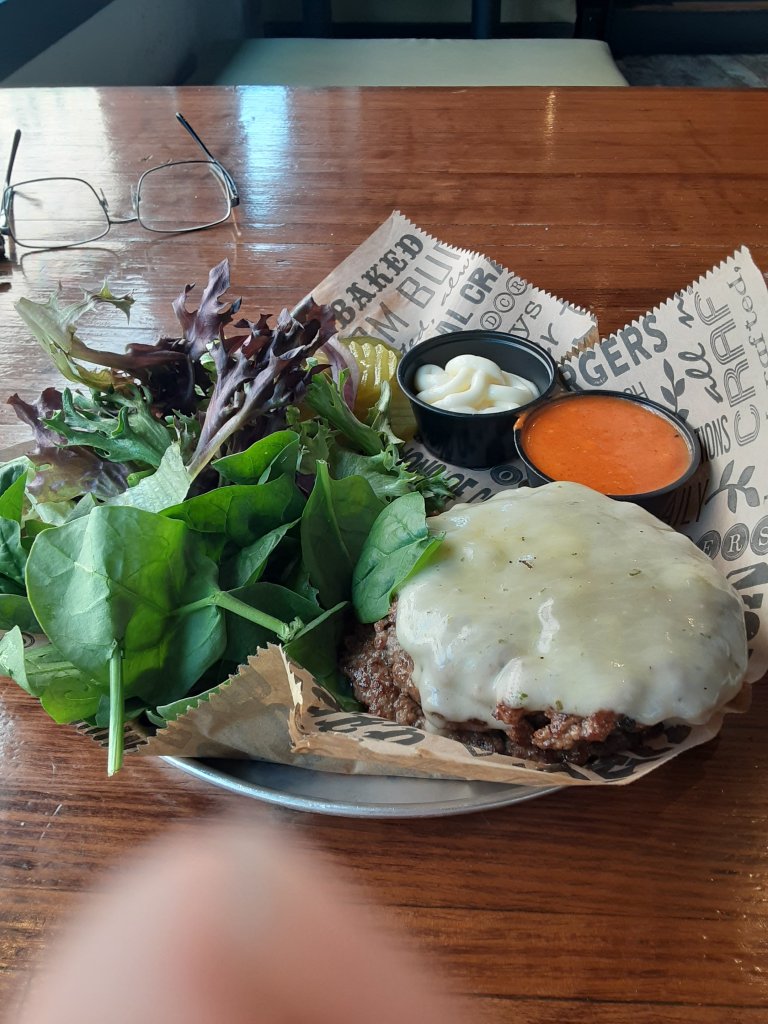 There is no good reason you should not enjoy a burger anytime you choose. Especially with mixed greens, spinach, raw red onion and dill pickle slices. Just toss away the bread..